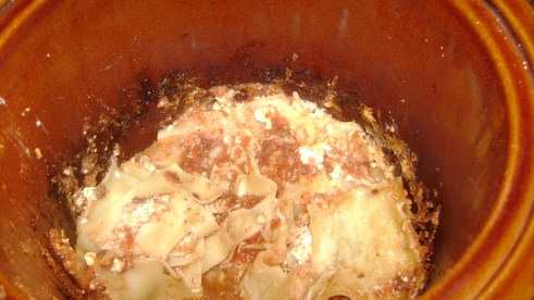 3. Next, I ran home during my 15 minute break between jobs, and layered non-cooked lasagna noodles (broken to fit the circular crockpot), spread them with cottage cheese, then sprinkled shredded Italian blend cheese and parmesan on top. Sprinkle with Italian seasoning.