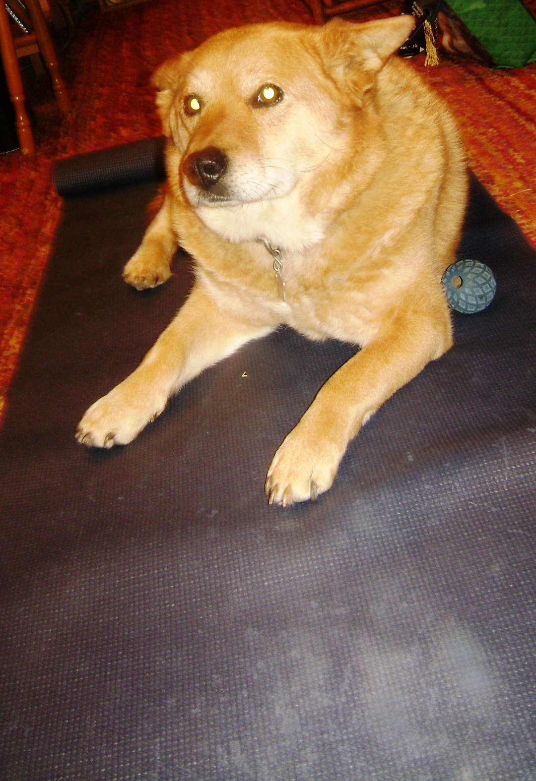 See the little blue ball? It does not belong to Jade. Even as a puppy she was too “mature” to play with toys or fetch. I roll around on that ball and use it as a foam roller of sorts to work out the soreness in my hips and IT band after running or skiing (problems I never had until I herniated a disc in my back in 2010). Please let me know if you have a good recommendation for a foam roller. I am thinking about getting one, but am afraid it will have to be very firm, like the ball, to acutally do anything for me!