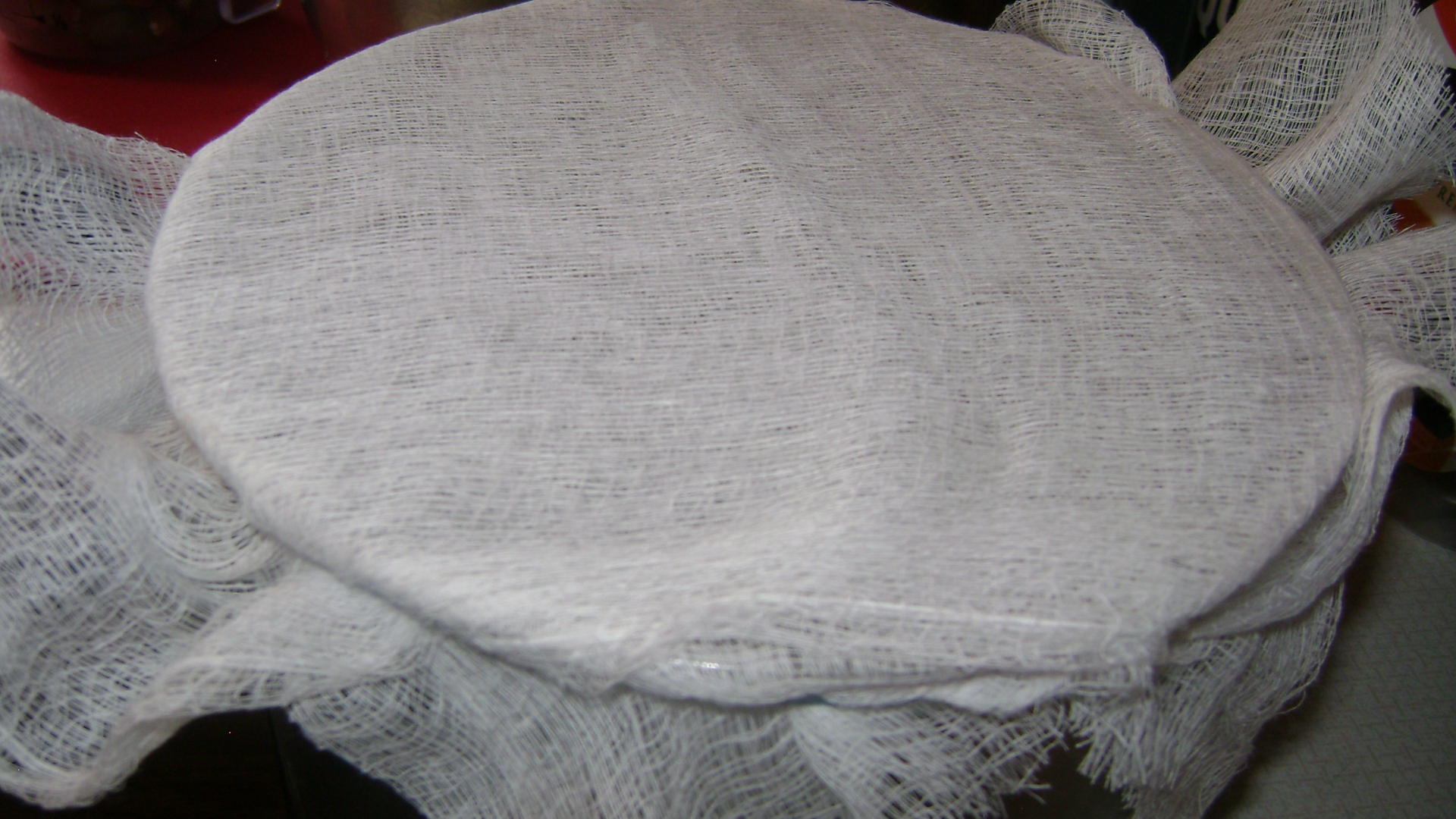 - Place a second layer of cheesecloth over the first from top to bottom and secure with another rubber band.
