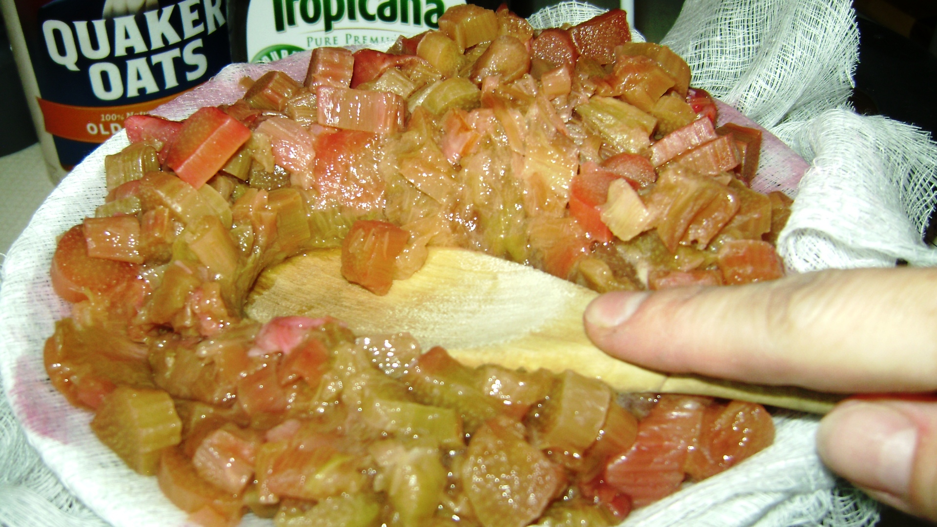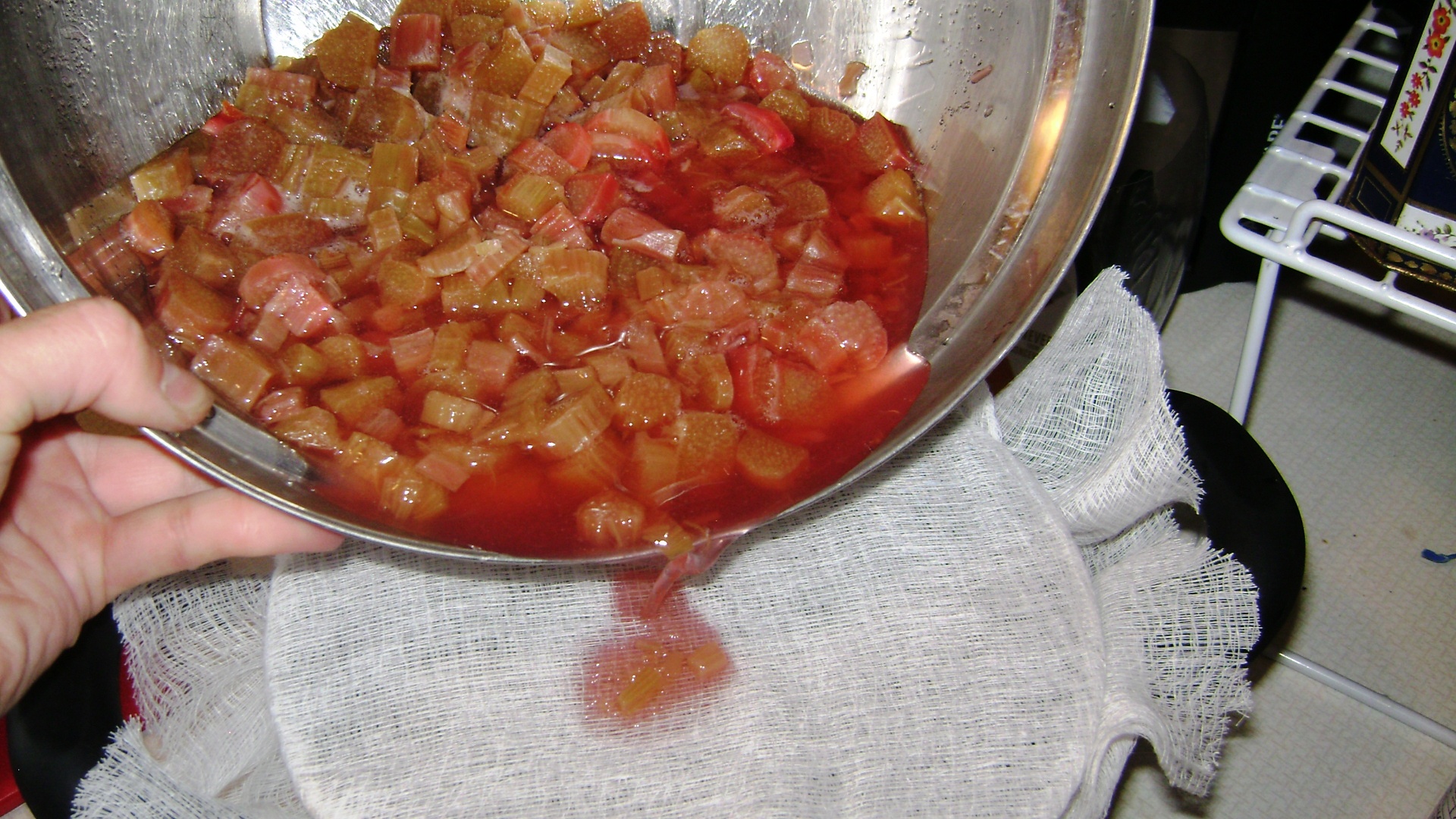 - When finished, scrape off rhubarb into trash/compost and THEN remove the cheesecloth so there are no accidents in spilling rhubarb chunks into the juice.