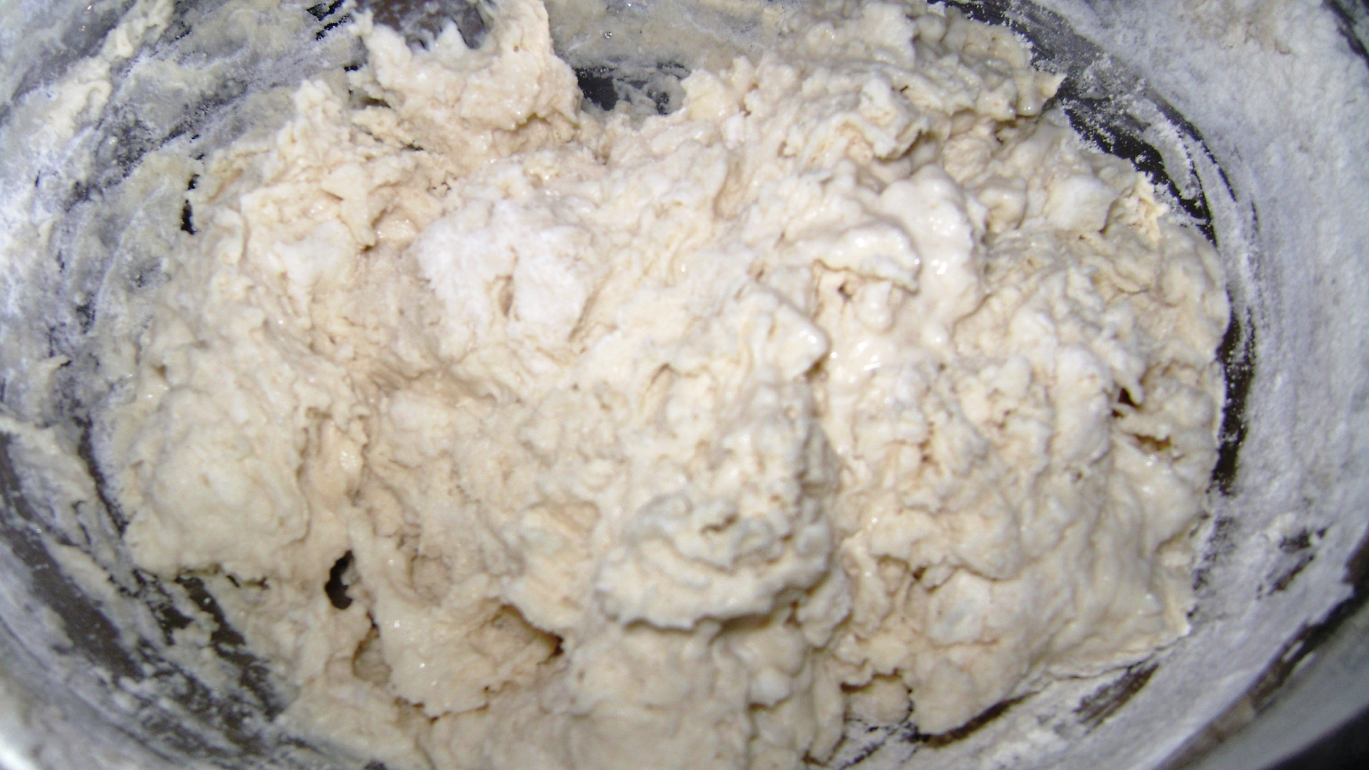 Add milk and stir until dough sags down into trough and pulls away from bowl edge.