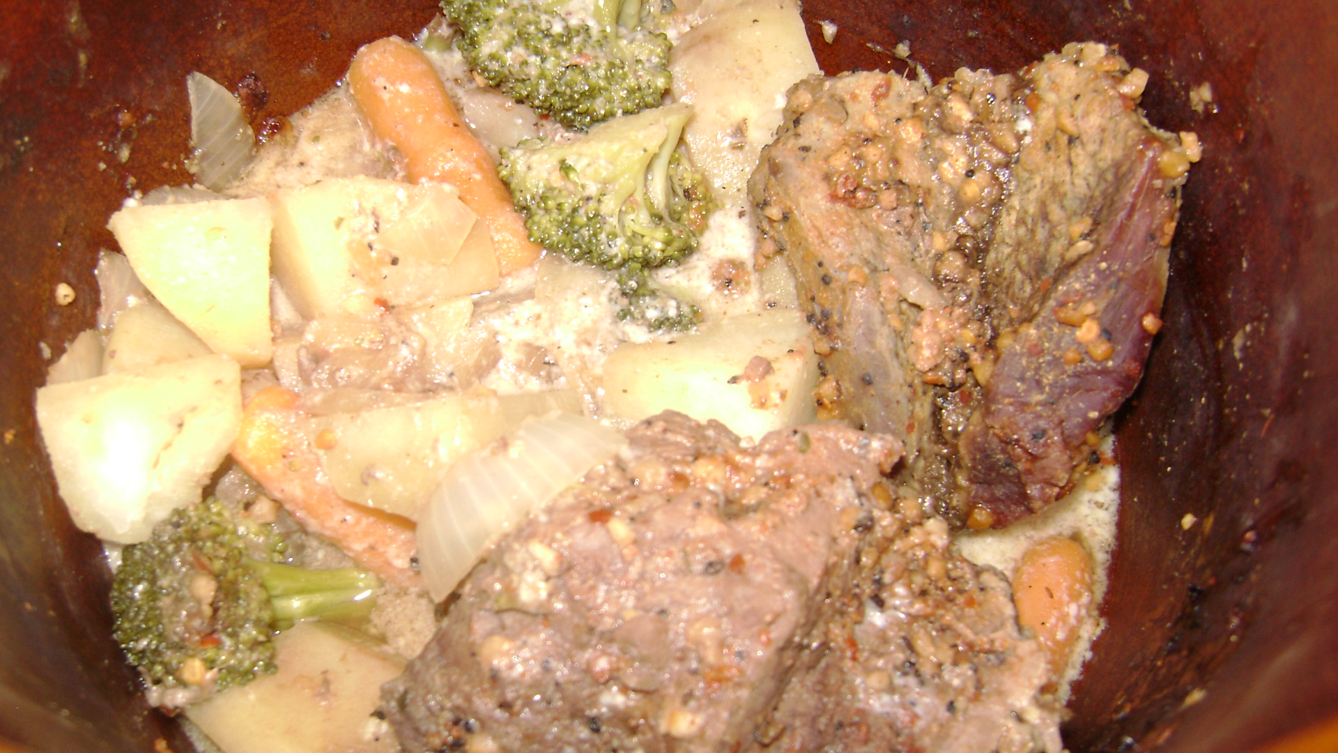 4. Place meat in slow cooker so it is covered by broth mixture.